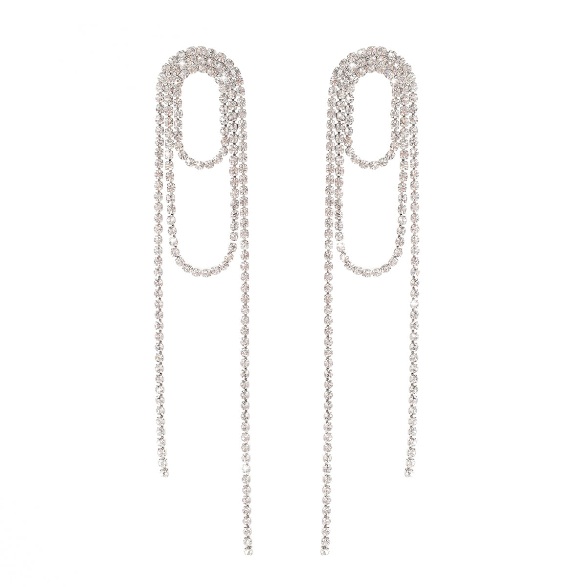 Elegance meets sophistication with our Janelle 4.75" Super Dense Silvertone Crystal Loop Earrings. Featuring a stunning design of densely packed crystals, these earrings will add a touch of glam to any outfit. With a length of 4.75 inches, they make a statement that is both elegant and inspiring. Elevate your look with these must-have earrings.